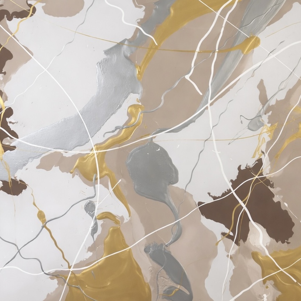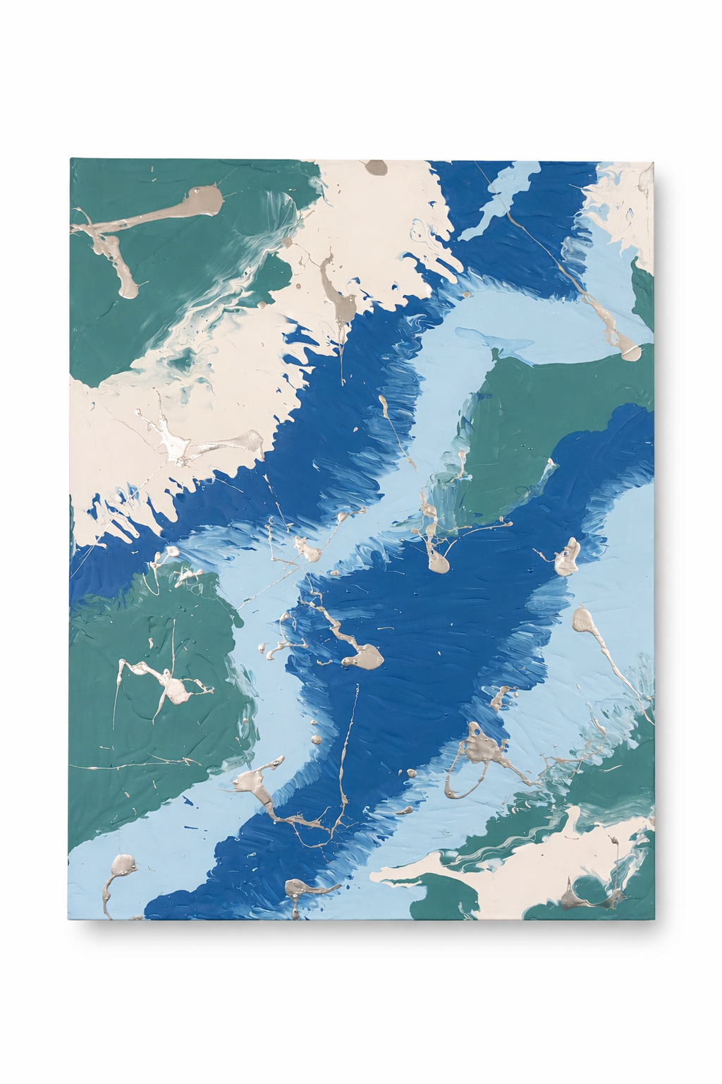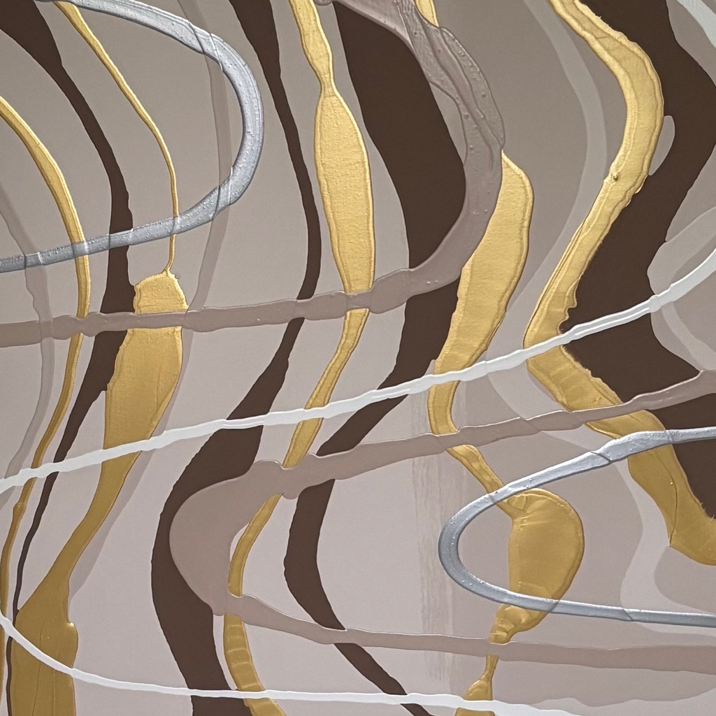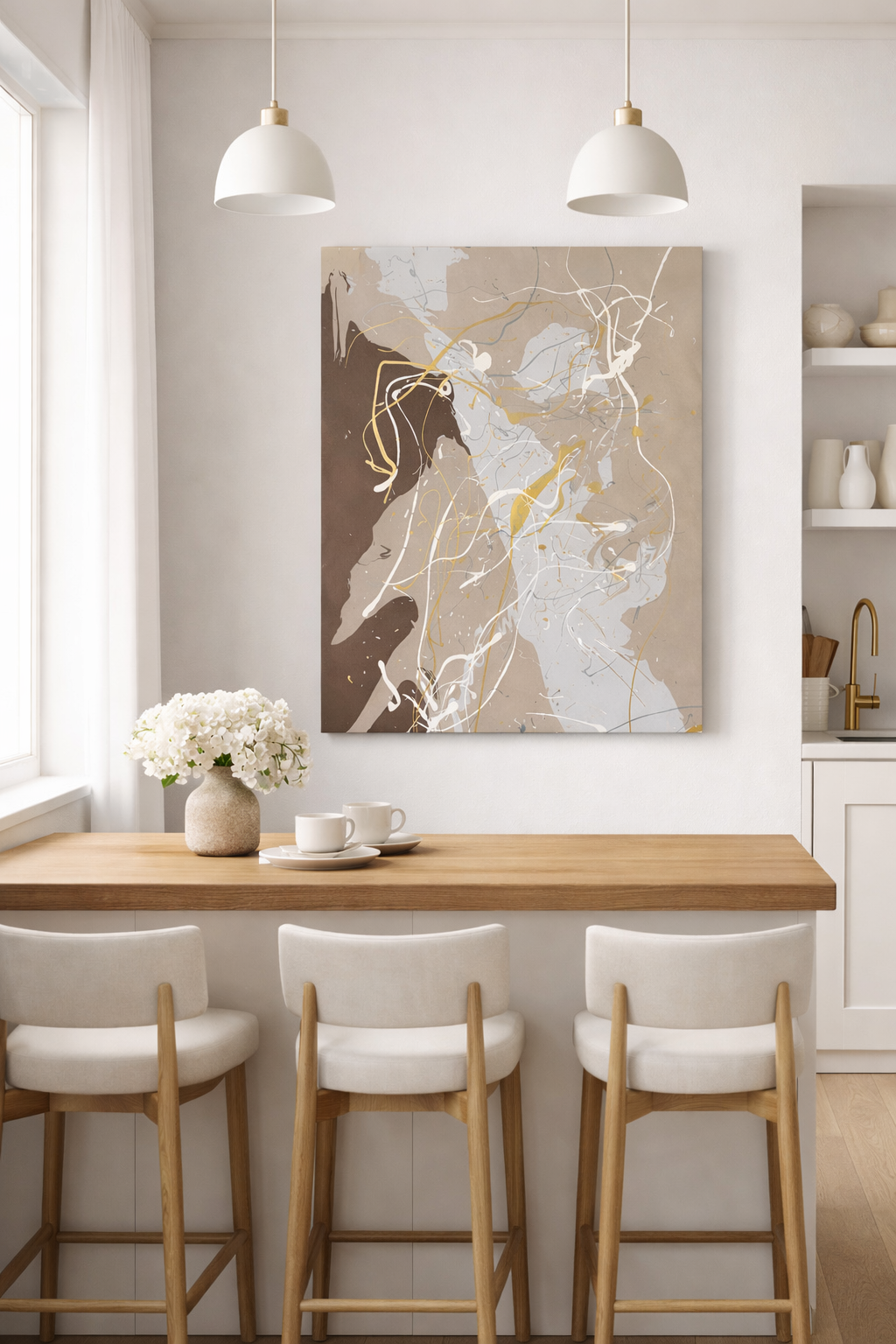 I work primarily in mixed media acrylic on canvas, layering matte finishes with gloss and metallic elements to create depth and shifting light. Pour techniques, structured brushwork, and deliberate negative space bring balance between control and spontaneity. Each piece is one-of-a-kind, built through layering, refinement, and disciplined intuition.