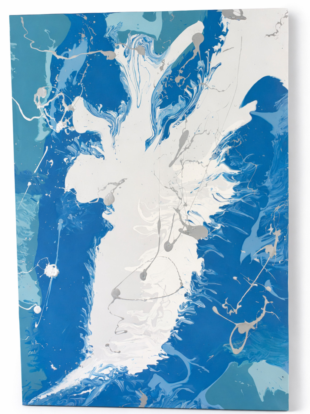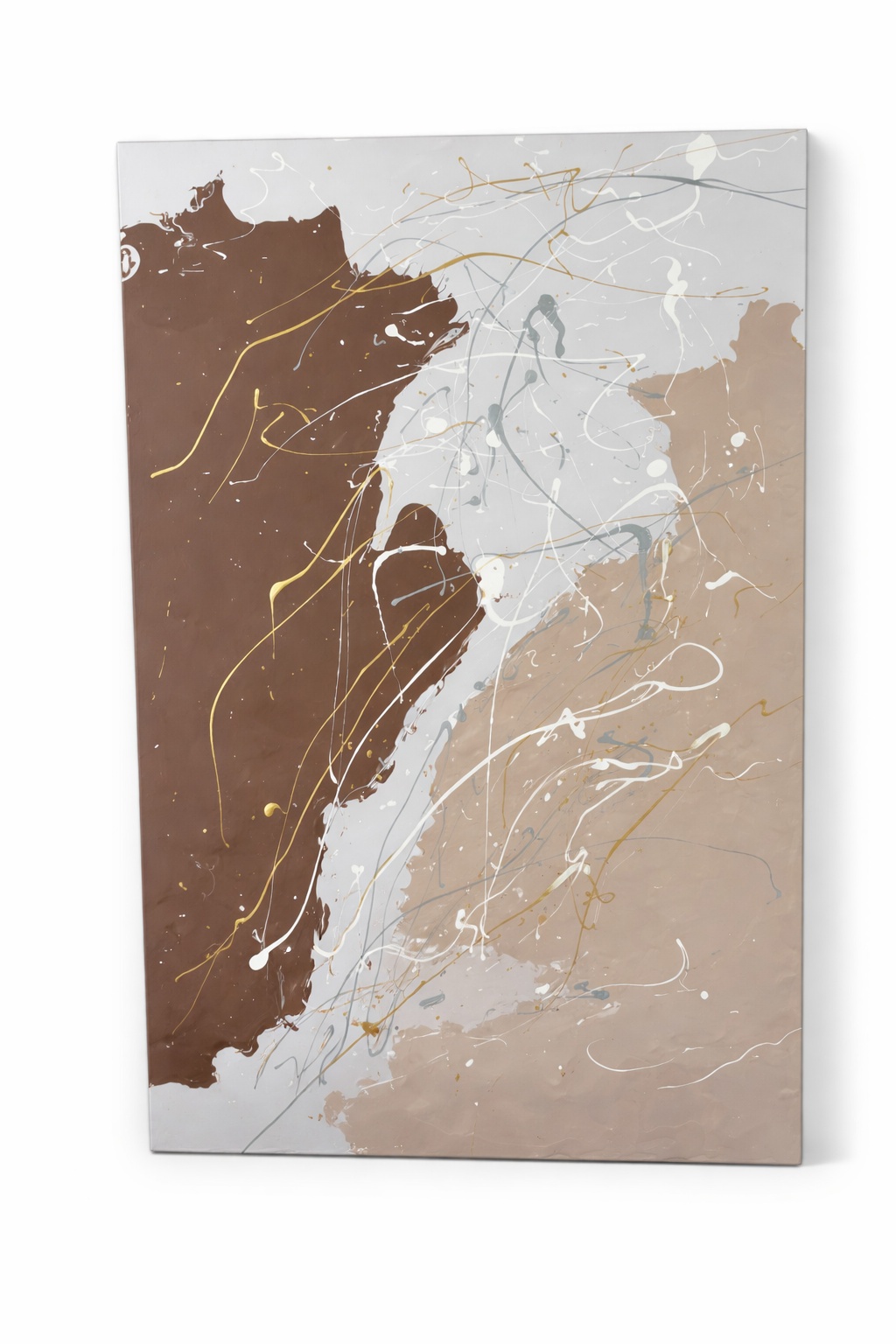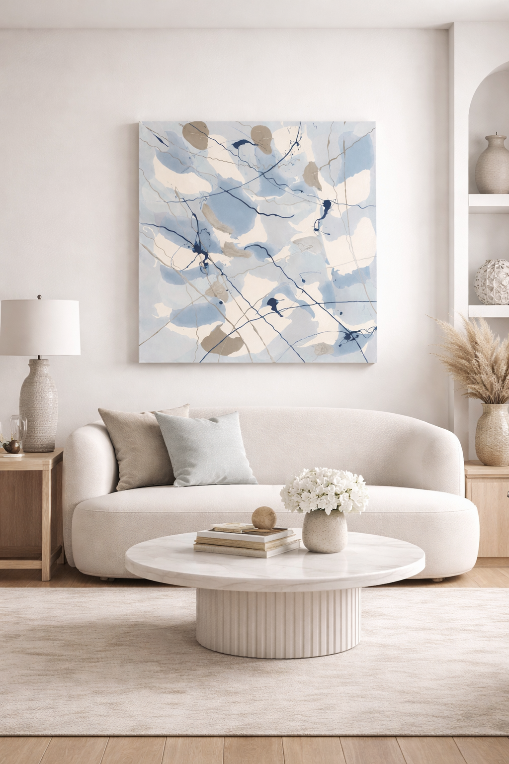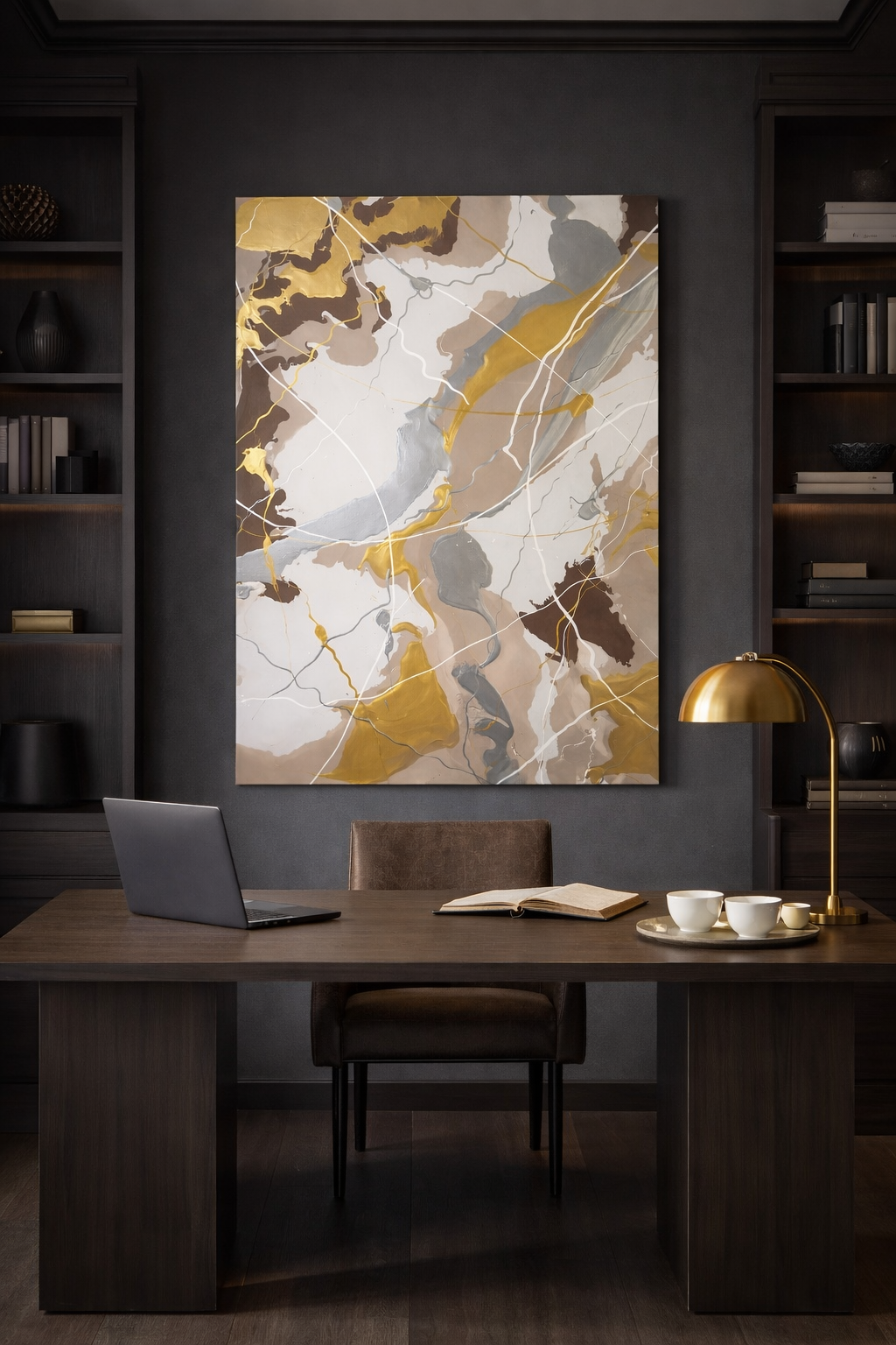 I work primarily in mixed media acrylic on canvas, layering matte finishes with gloss and metallic elements to create depth and shifting light. Pour techniques, structured brushwork, and deliberate negative space bring balance between control and spontaneity. Each piece is one-of-a-kind, built through layering, refinement, and disciplined intuition.