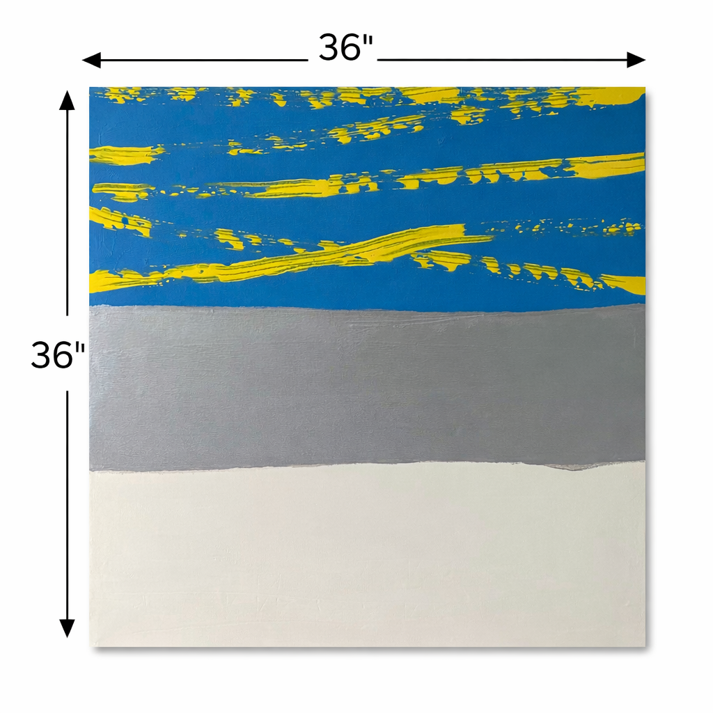 Echo of Light captures the quiet shimmer that lingers after brightness meets stillness. Layers of matte blue and warm beige create a calm, grounded foundation, while metallic silver accents reflect light across the surface like sun glancing off water. Gloss yellow strokes move with intention through the composition, introducing warmth and subtle energy without disrupting the balance.