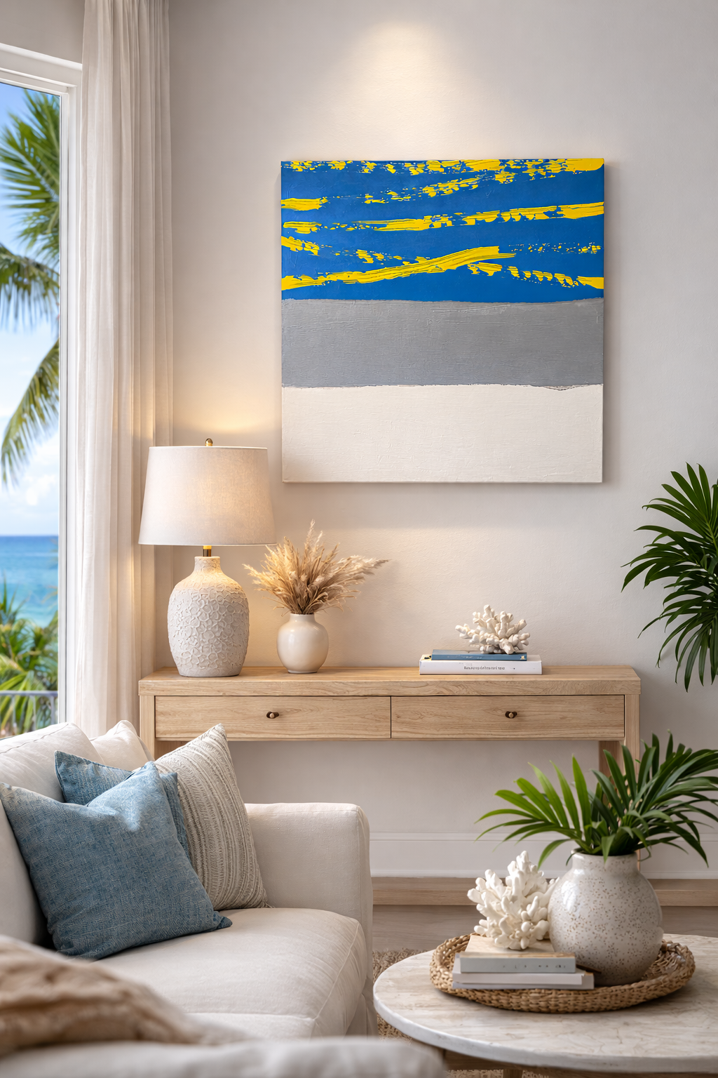 Part of the Surface & Stillness collection, Echo of Light explores the tension between outer radiance and inner reflection — the surface shimmer and the calm beneath it. Sophisticated yet luminous, this piece brings refined warmth and contemplative energy to modern contemporary and coastal interiors.