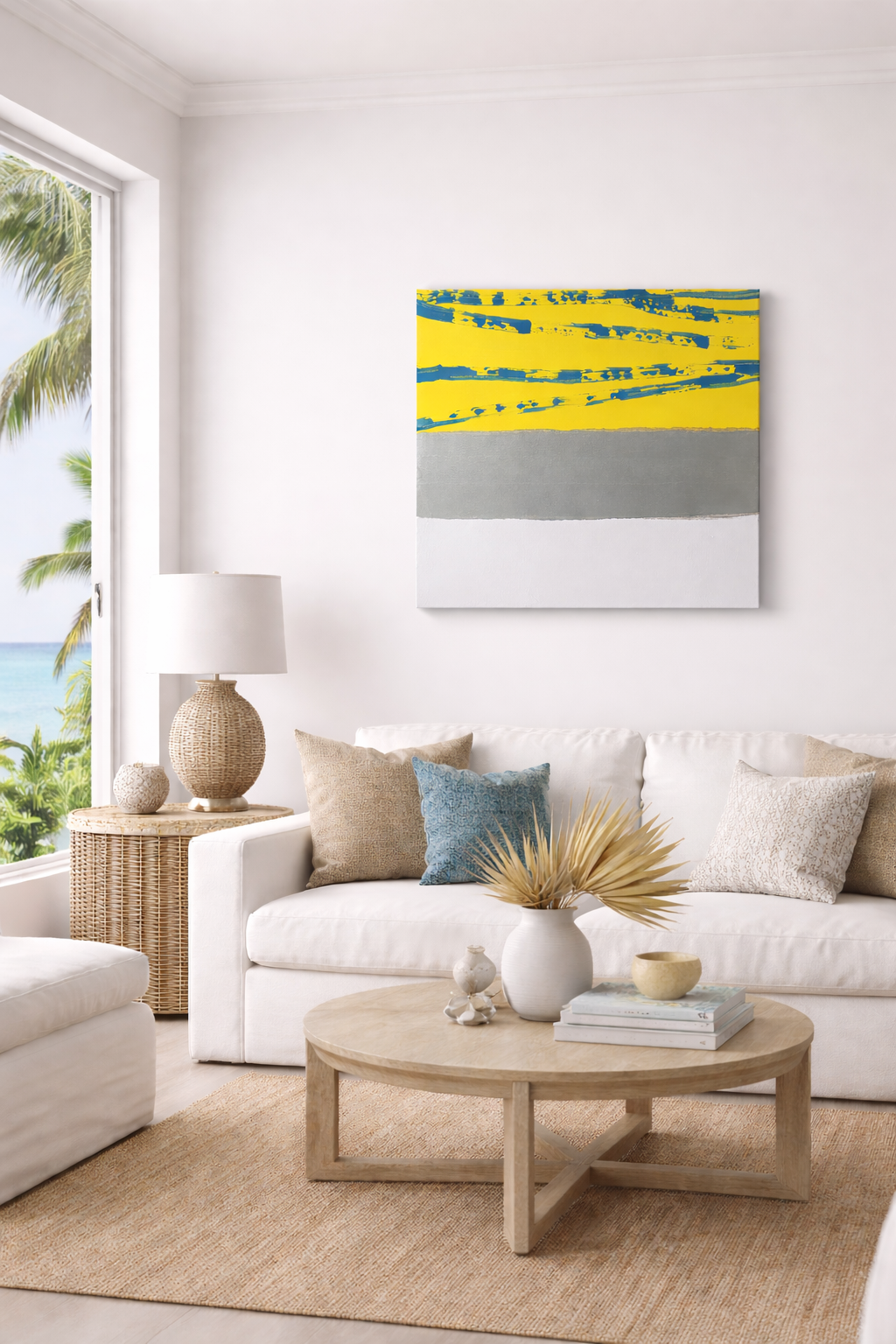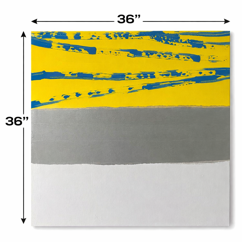 Across the yellow surface, textured gloss blue strokes move with intention — fluid, expressive, and dimensional. The interplay between matte and gloss creates depth and contrast, allowing the piece to evolve as light moves throughout the day. Metallic silver accents catch and release reflection, adding a refined, contemporary luxury.