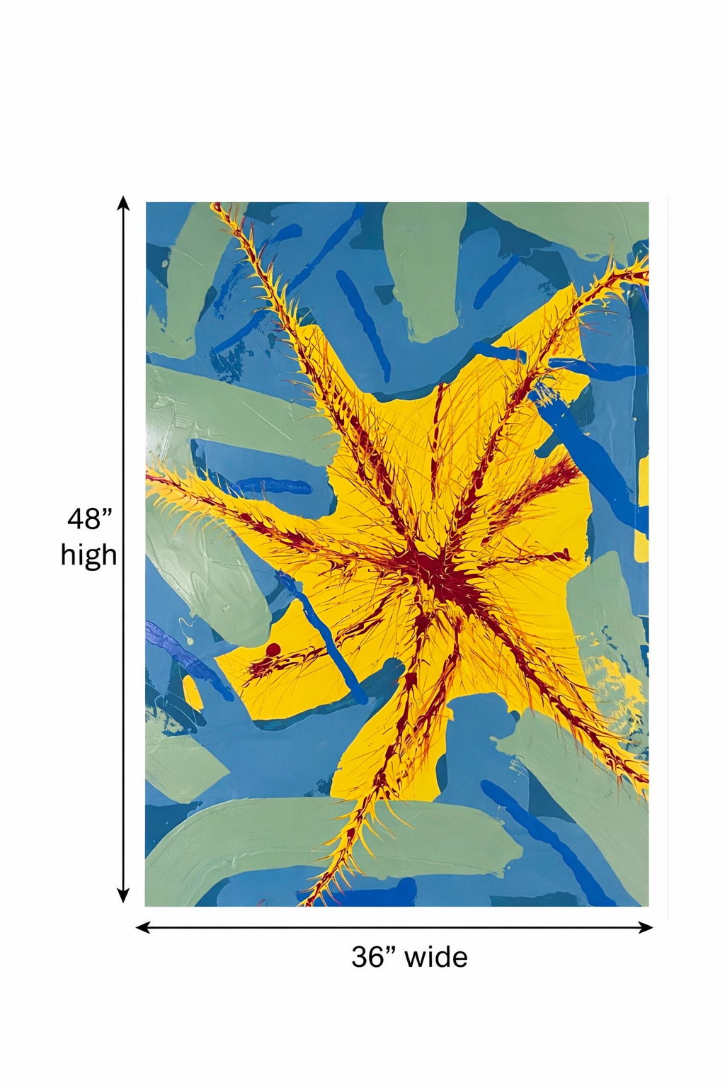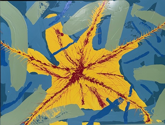 Light Reaching In captures the moment tension gives way to breakthrough. A layered matte field of blues and yellow creates atmospheric depth, while bold gloss strokes of blues greens yellow and red rise across the surface — catching light and shifting as the viewer moves around it.